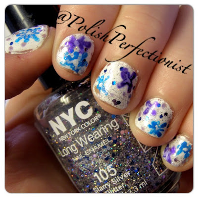 For this snow manicure, I started off with Hard as Nails by Sally Hansen as a base. I then added the O.P.I. Ridge Filler base coat. I used 2 coats of Sinful Colors - Snow Me White. I added one coat of NYC - Starry Silver. For the snow flakes, I used Sinful Colors - Let's Talk and Sally Hansen Xtreme Wear - Blue Me Away! I decided to add some little purple dots. For this I grabbed a dotting tool and used Sally Hansen Complete Salon Manicure - Delphinium! For a topcoat I used Out The Door.